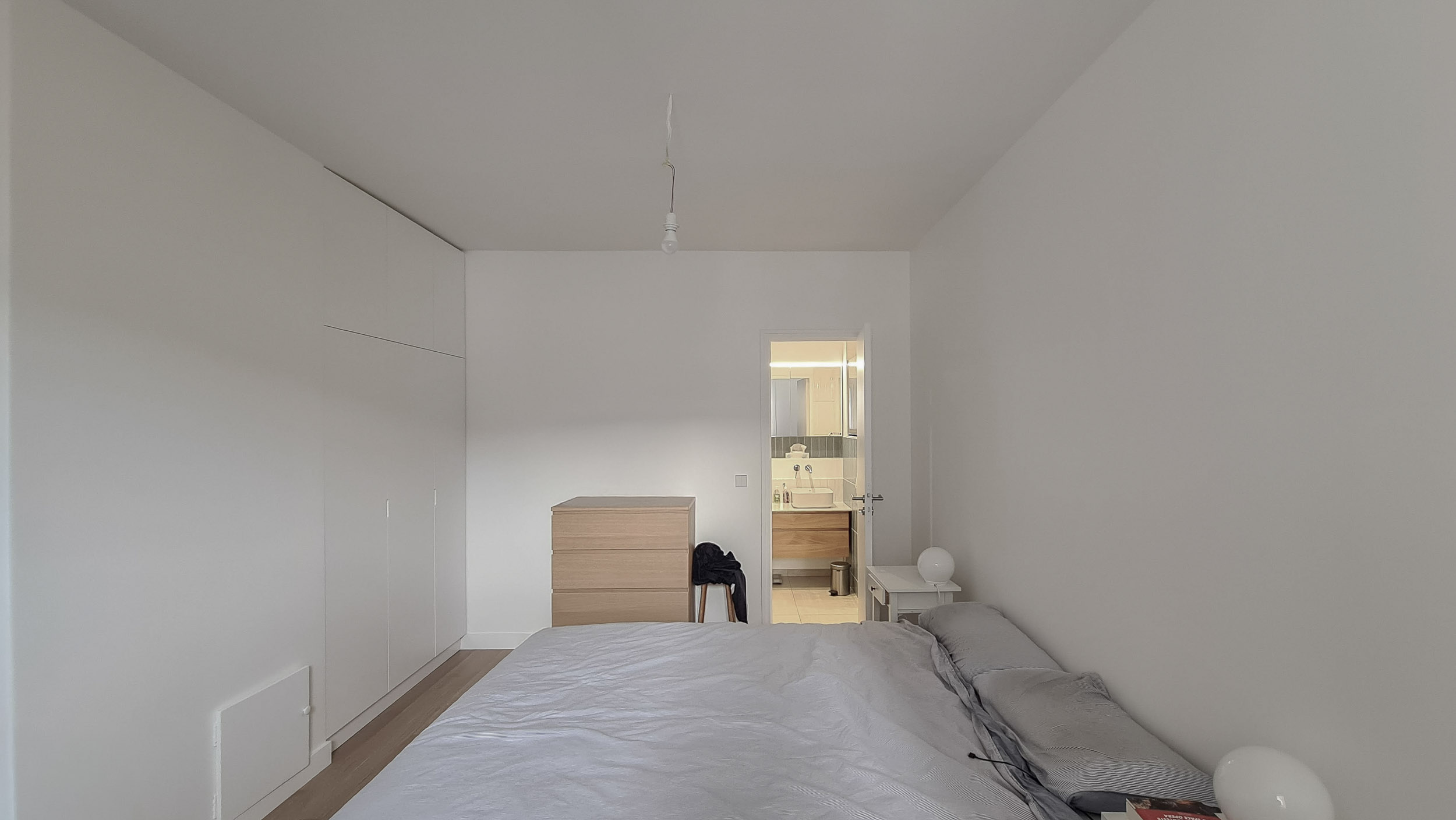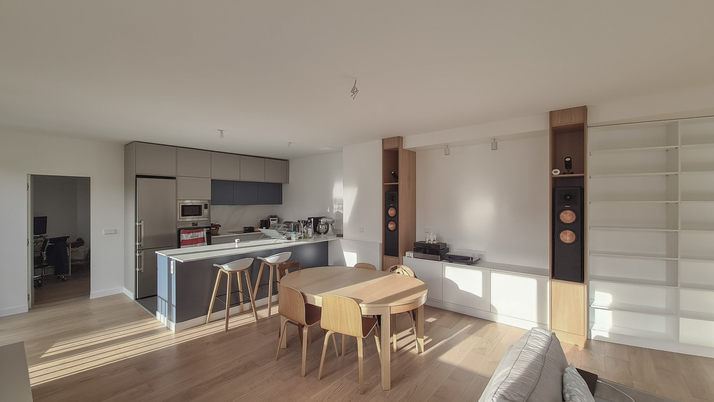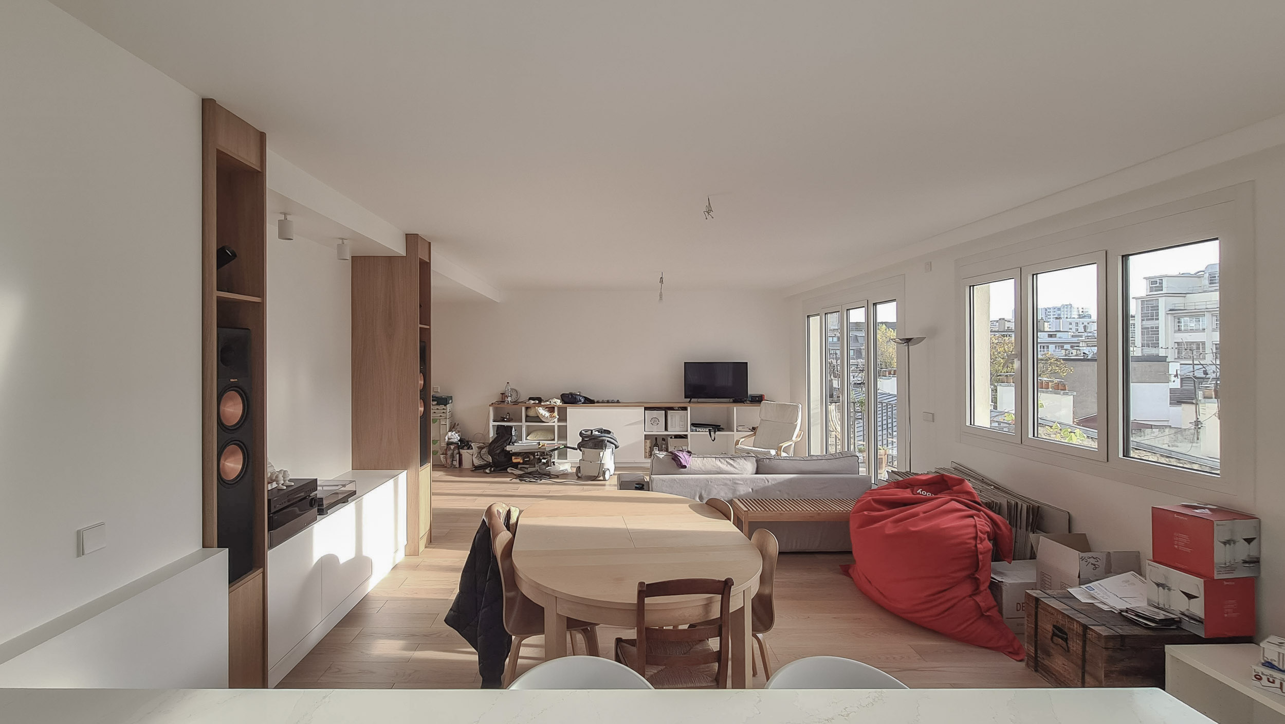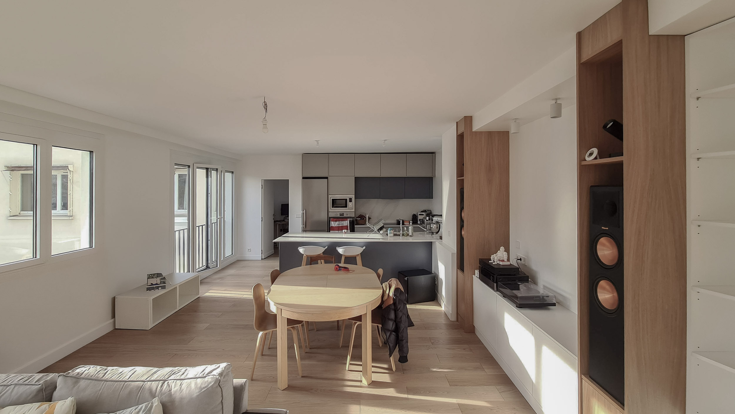 Le geste architectural fondateur fut de faire tomber la frontière. Le mur séparant l’ancien salon de la chambre voisine a été abattu, non pas comme une simple démolition, mais comme l’acte de naissance d’un nouvel espace. De cette union est née une pièce de vie spectaculaire, un plateau libre qui s’étire sur trois trames et s’ouvre généreusement au Sud. Un parquet en bois clair unifie désormais l’ensemble des pièces à vivre, servant de fil conducteur chaleureux entre les anciens appartements. Sur ce sol continu, la lumière naturelle se déverse enfin, transformant totalement la perception des volumes.