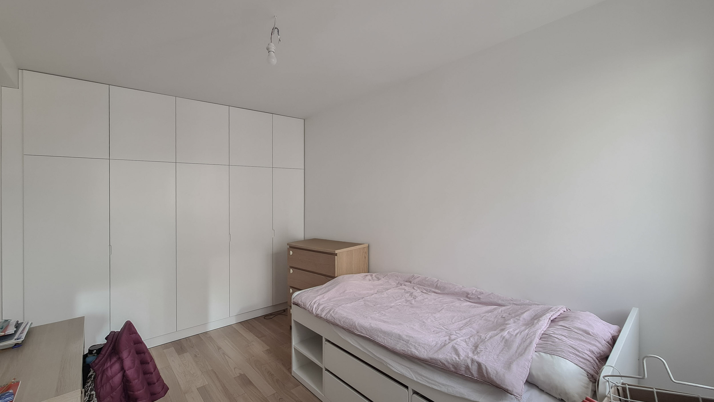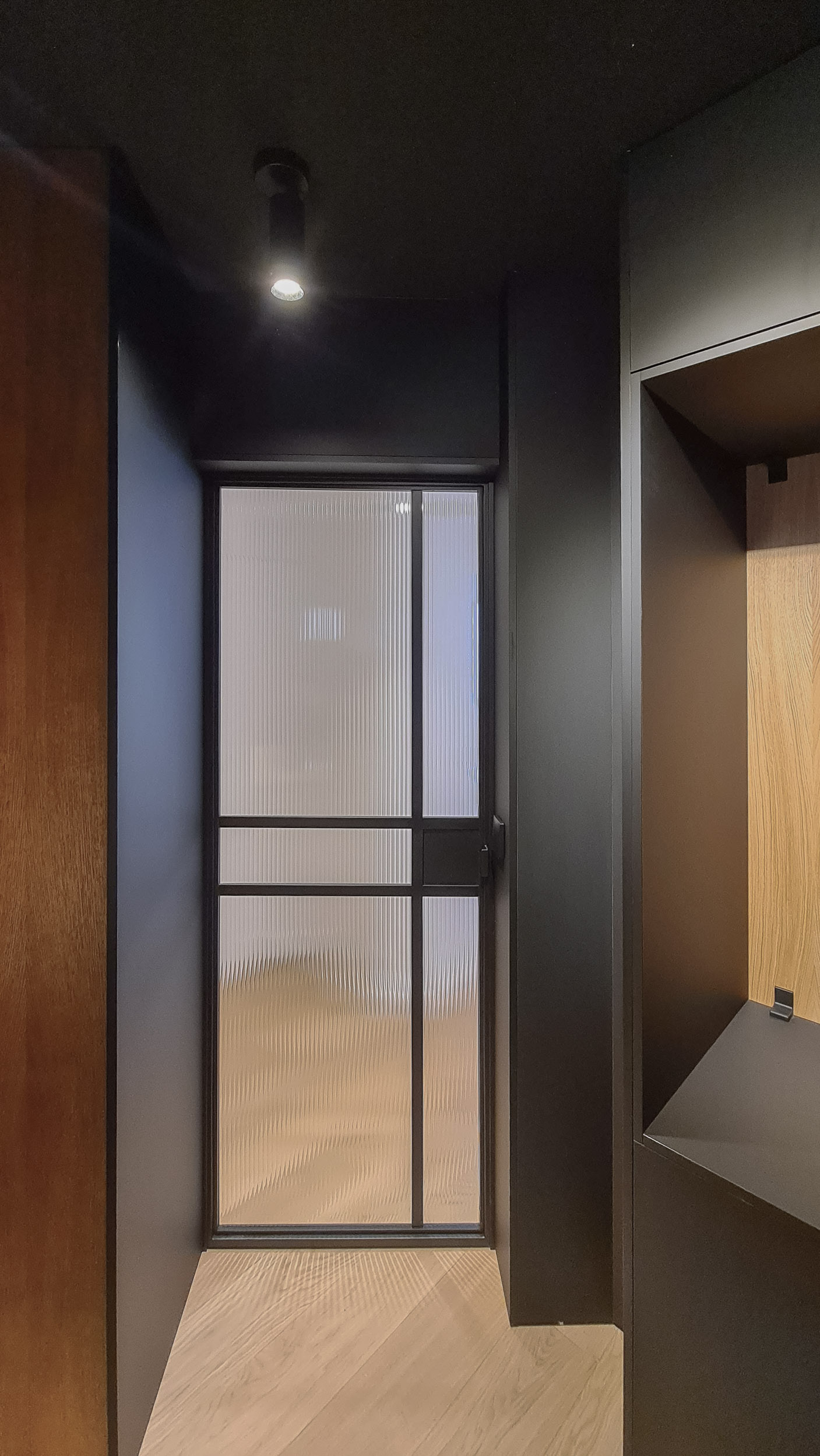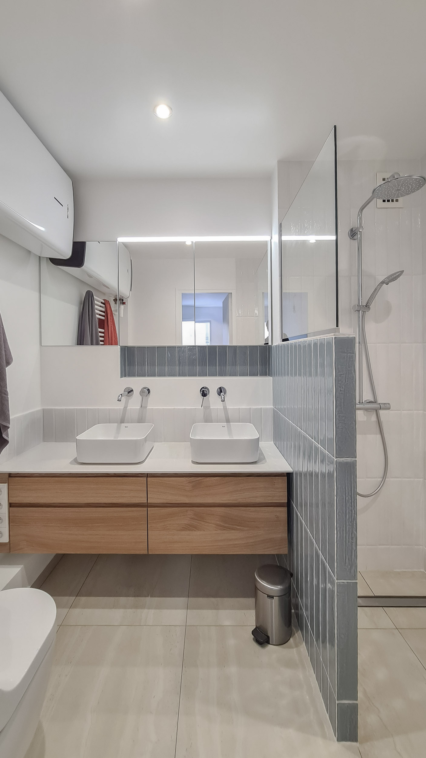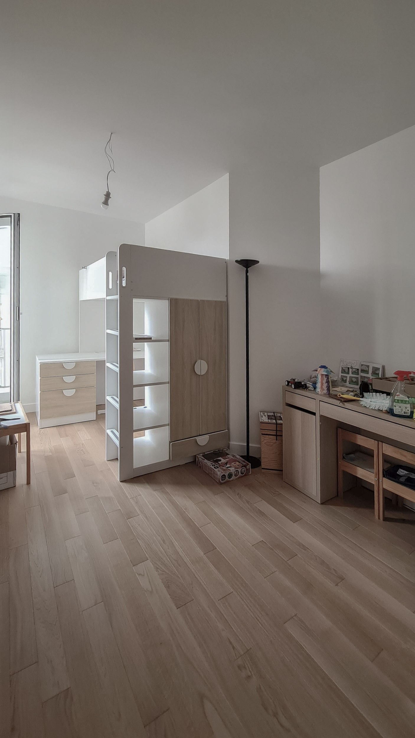 Pour adoucir les lignes brutes de la structure originelle, une palette où les teintes pastel dialoguent avec la chaleur du bois enveloppe l’ensemble, créant une atmosphère sereine et tactile. Au cœur de cette géographie réinventée se dresse la pièce maîtresse : un grand meuble en bois sur mesure, conçu comme une colonne vertébrale organique et chaleureuse. Ses courbes boisées et sa matérialité naturelle contrastent superbement avec la rectitude du bâtiment. Il orchestre la partition du grand volume, dessinant une frontière subtile entre l’énergie du salon et l’intimité de l’espace nuit. Plus qu’un simple séparateur, il se fait écrin de tranquillité, une alcôve dans laquelle on peut s’isoler, offrant une parenthèse de douceur dans la ville.